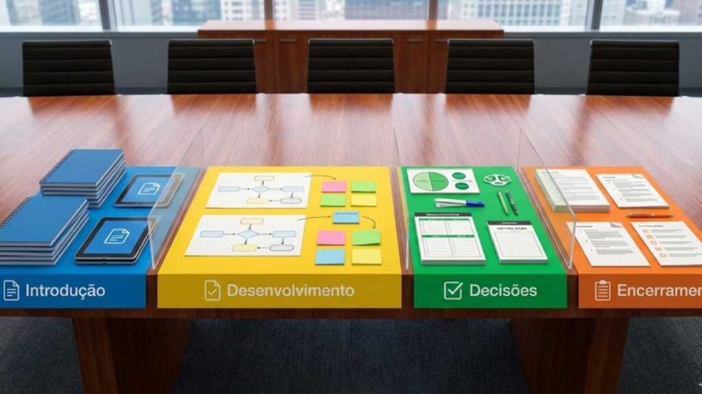 Uma reunião de meio período precisa de uma pauta organizada em blocos claros. Isso ajuda a controlar o tempo e evita discussões intermináveis.
